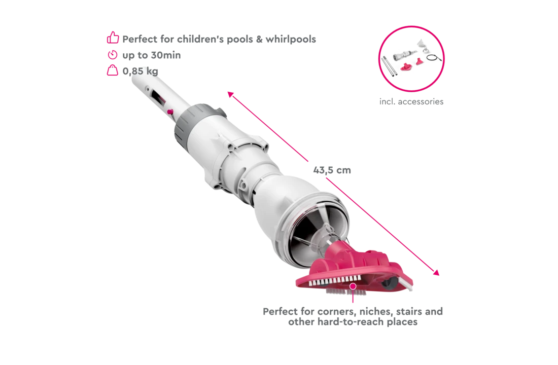 Deze stofzuiger heeft een krachtige zuigkracht en driehoekige borstelkop voor een efficiënte en gemakkelijke reiniging van zwembaden tot 10 m³. - Draadloos gebruikt: