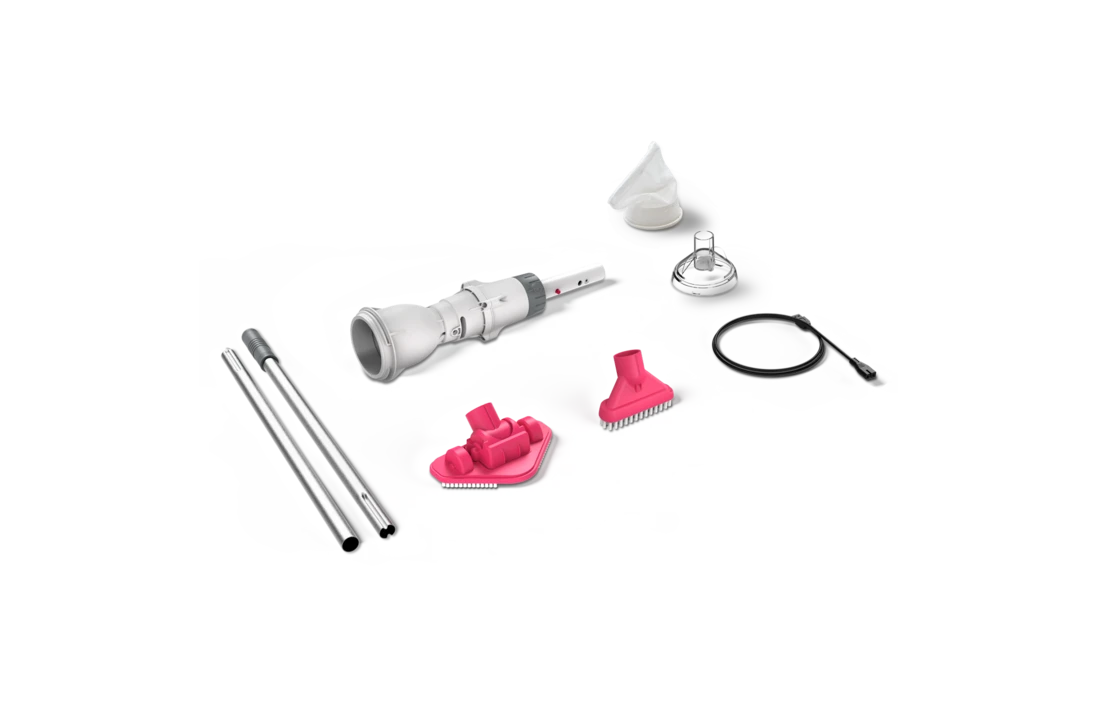 Zwembadstofzuiger, oplader, stok en platte borstelbevestiging met 2 jaar garantie.