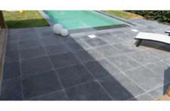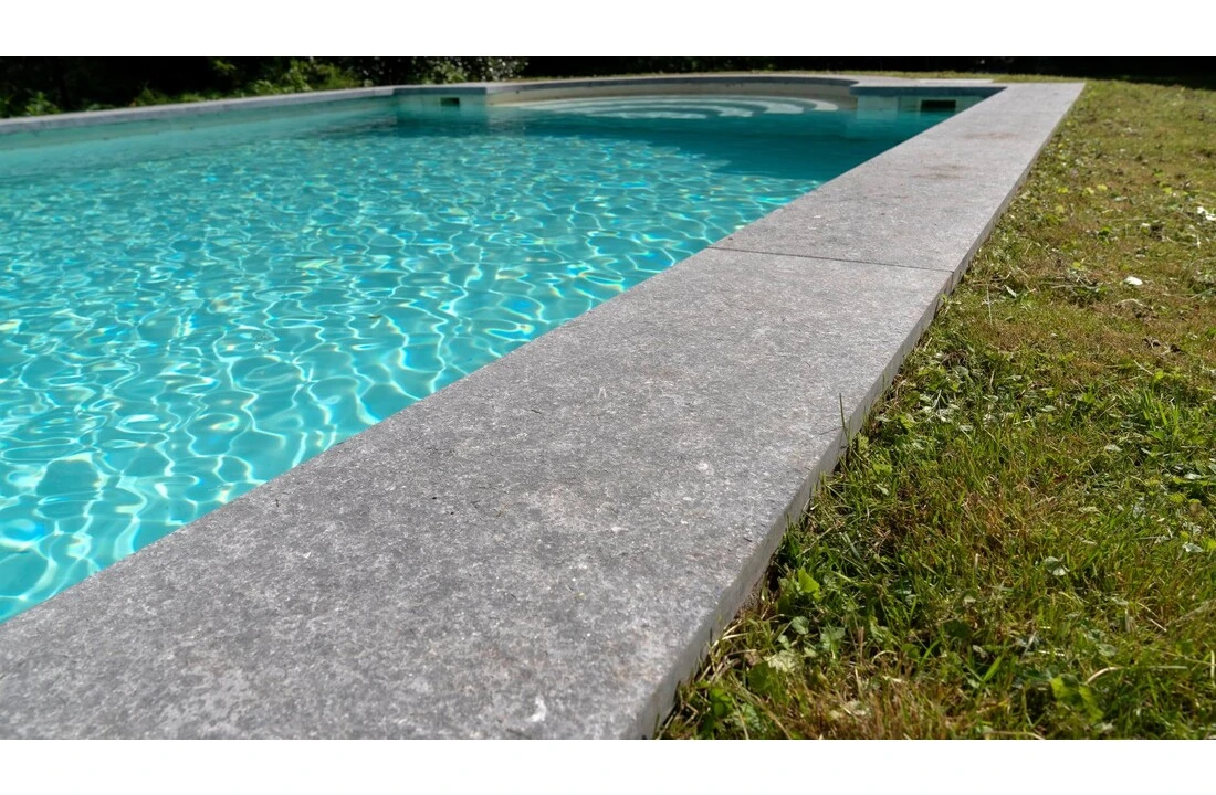 Belgische blauwe hardsteen zwembadranden geeft uw zwembad een luxueuze uitstraling. Te verkrijgen in gezandstraalde en in gebrande afwerking,