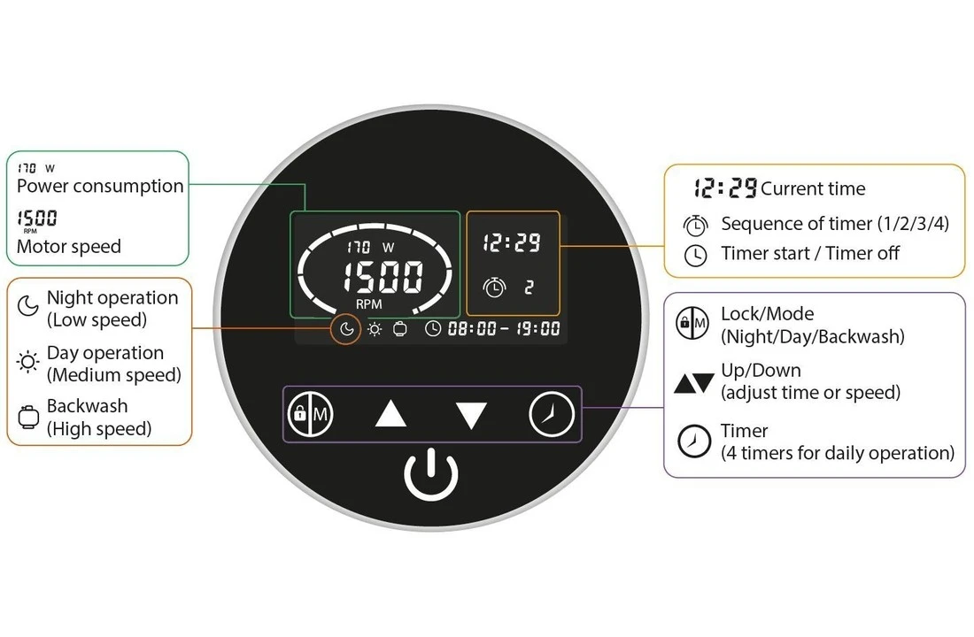 - TIMER FUNCTIES: 4 timers voor 24-uur gebruik, elk met een aparte snelheid voor verschillende zwembad toepassingen, filtratie of verwarming.